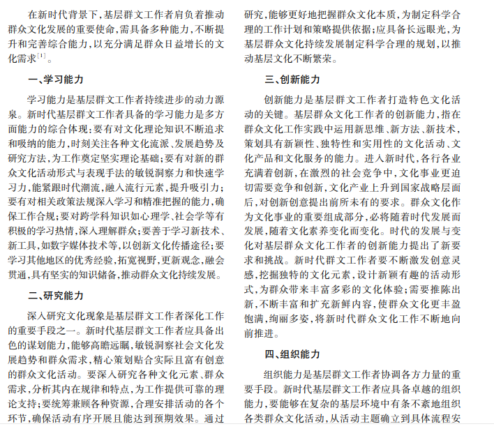 基层群文工作者对推动群众文化发展至关重要,需不断提升和完善综合能力,以充分满足群众日 益增长的文化需求。本文探讨新时代基层群文工作者应具备的能力。