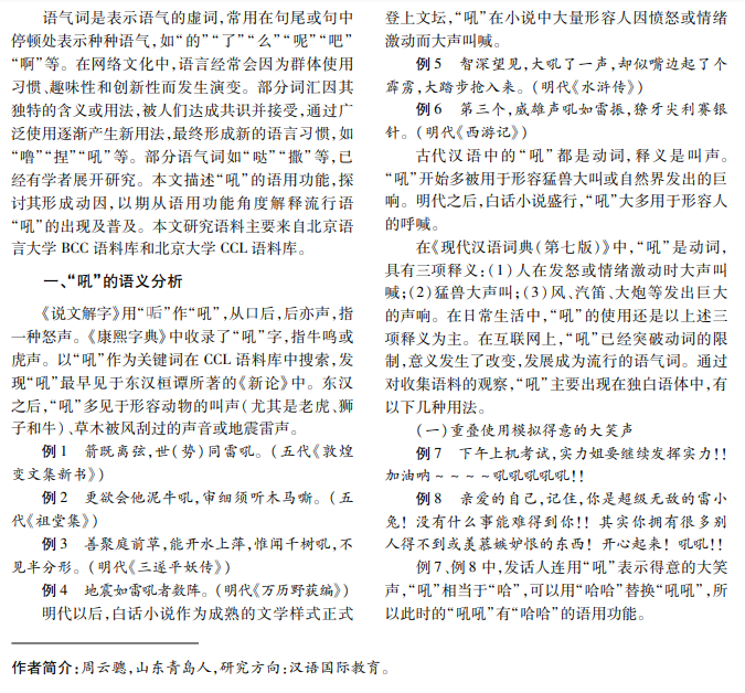 近年来,语气词在提升语句表现力和传达情感方面具有重要作用,“吼”在互联网中出现新的用法, 由动词演变为语气词,衍生语气词义。本文通过 BCC语料库和 CCL语料库,考察“吼”的语用功能,发现“吼”在 网络语境中有多种用法。“吼”由动词演变为网上流行的语气词,主要是由于其比传统语气词更能精确把握传 递的情绪、满足年轻人网络聊天张扬个性的要求及女性网民的大量使用。