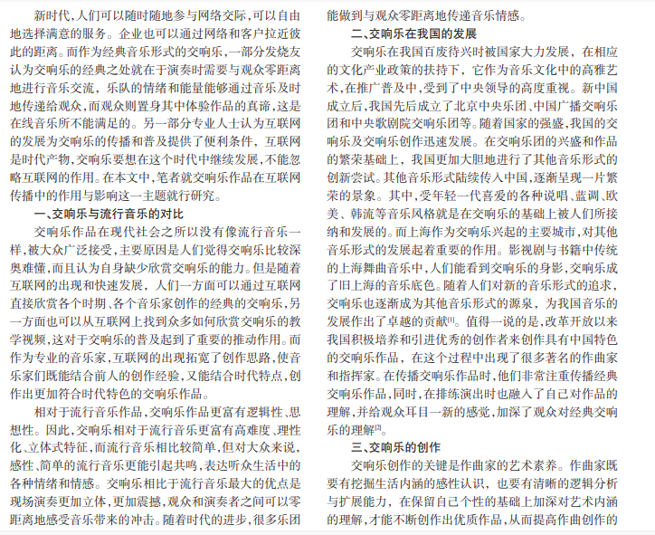 随着互联网的发展,网上购物、在线看电影和听音乐成了人们的生活常态。一部手机加上无线网络,喜爱 的音乐就可轻松地在耳畔回响。在信息技术与网络技术高速发展的时代,交响乐面临着新的机遇和挑战。本文主要就 交响乐在新时代的发展进行分析研究。