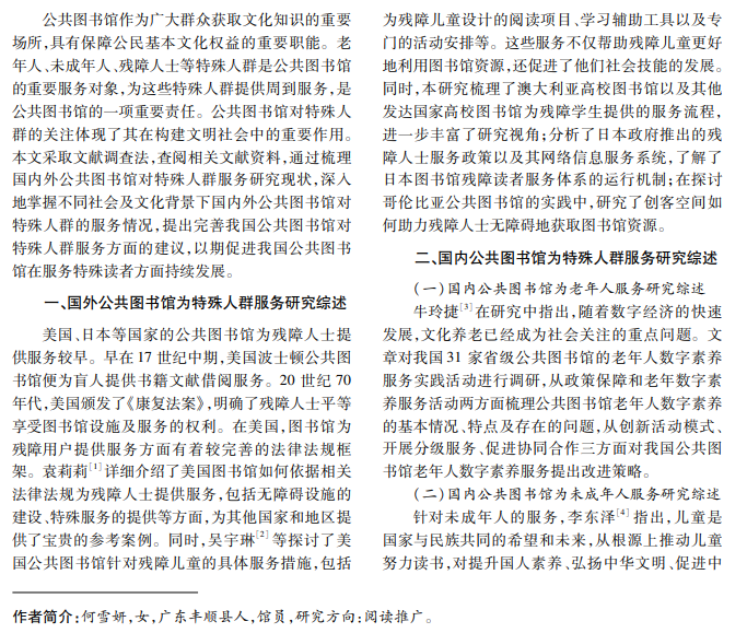 公共图书馆是保障人们基本文化权利的公共渠道之一。服务和帮助特殊群体是公共图书馆的职 责。近年来,对图书馆为特殊人群服务的研究成为一个重要课题。本文采用文献调查法,梳理国内外公共图书 馆为特殊人群服务的研究现状,给出公共图书馆为特殊人群服务的建议,以供同行交流,促进特殊人群文化权 益维护与实现。