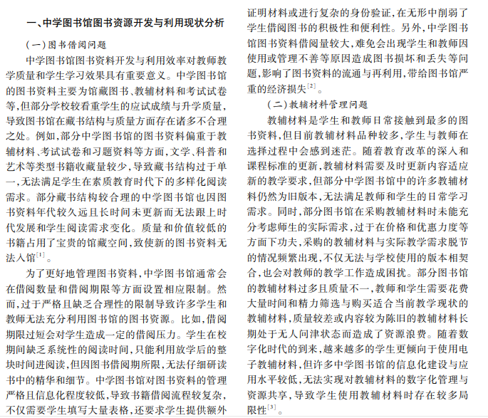 图书馆既是学生获取知识的重要场所,也是培养学生良好阅读习惯的重要途径。中学图书馆的图 书资料主要分为书籍资源、教辅材料和试卷档案,部分中学图书馆在图书资料开发与利用方面存在不足。本文 分析中学图书馆图书资料开发与利用过程中存在的问题,并提出相应解决措施。