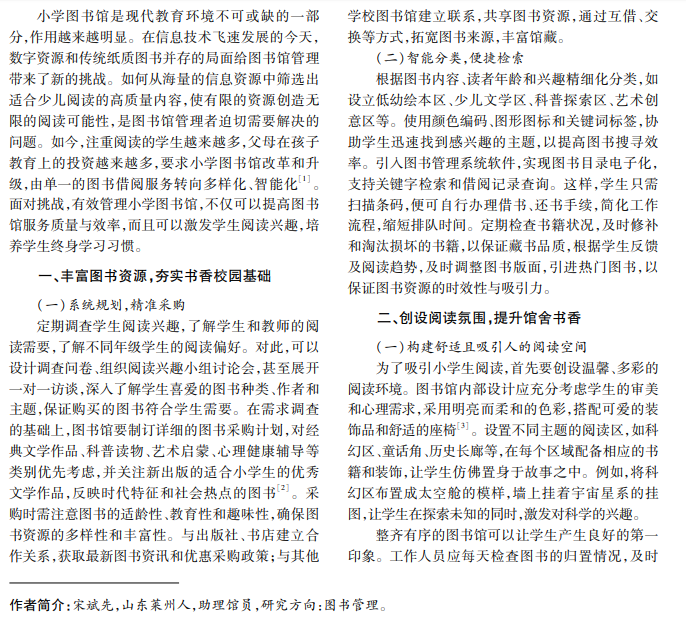 在知识殿堂里,少儿图书馆扮演着至关重要的角色,它是孩子们探索世界的起点,是梦想启航的港 湾。在数字化时代,如何让图书馆成为孩子们的知识绿洲,如何让每本书都发挥出其应有的教育价值,是一个 重大课题。本文探讨如何做好少儿图书馆的管理工作,如何通过优化资源、创新服务等手段为孩子们构建良好 的阅读空间。