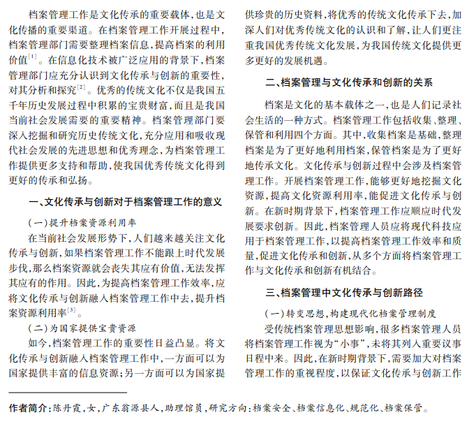 档案管理作为一项基础工作,需立足于发展现状,注重文化传承,创新管理模式,完善管理机制。 本文分析新时期背景下文化传承与创新对档案管理工作的意义,提出档案管理工作中文化传承与创新的有效 路径。