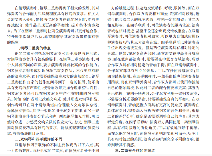 对于钢琴二重奏而言,四手联弹和双钢琴是较为常见的两种合作形式。二者在沟通难度、演奏者间的相互 影响、演奏音域、踏板使用、音乐把握和听觉角度等方面存在很大的不同,相关人员需要深入分析,确保根据二重奏的具 体需求科学选择合作形式,进而保障更为高效地将钢琴作品呈现出来,使听众进一步感受音乐作品表达的情感,确保 受众产生强烈的情感共鸣。本文首先分析钢琴二重奏的特点,然后进一步探究双钢琴和四手联弹之间的差异,最后从 合作意识、倾听习惯与合作练习三个方面探究实现二重奏合作的策略,希望钢琴演奏者能够更为完美地呈现二重奏作 品,有效提升演奏效果。
