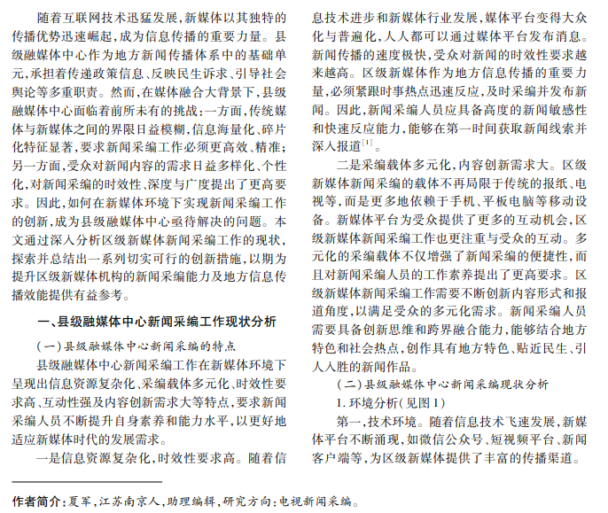 随着信息技术飞速发展和媒体融合加速推进,县级融媒体中心作为地方信息传播的重要力量,面 临着前所未有的挑战与机遇。为增强新闻采编的时效性、准确性和影响力,县级融媒体中心亟须采取创新措 施。本文旨在为县级融媒体中心提供实践指导与理论支持,助力其在复杂多变的媒体环境中脱颖而出,更好地 服务于地方社会经济发展。