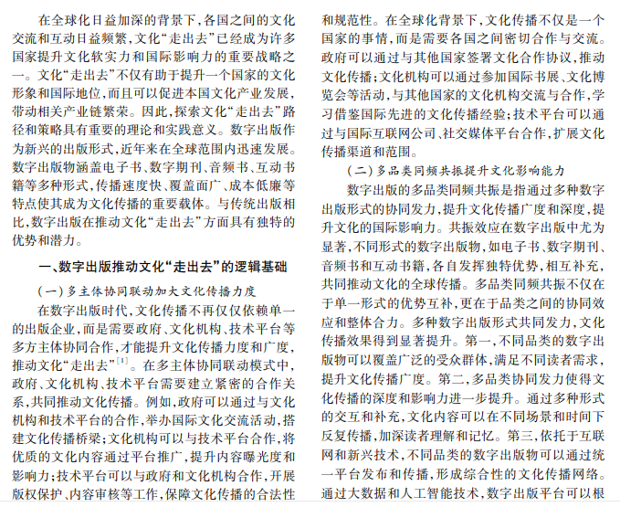 数字出版作为新兴的出版形式,通过独特的技术优势和传播手段,成为推动文化“走出去”的重要 力量。本文从多主体协同、多品类共振、全域化政策体系等方面探讨数字出版推动文化“走出去”的逻辑基础, 分析数字版权面临的困境,提出相应对策,以期为数字出版在文化传播中的应用提供理论和实践支持。