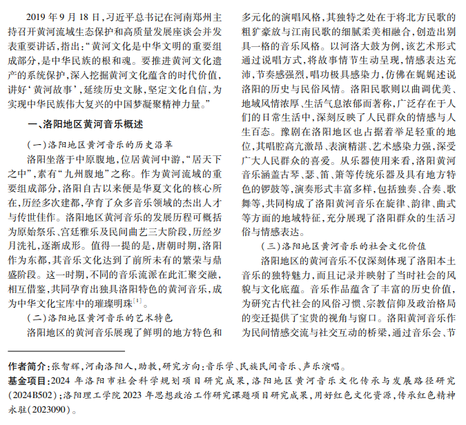 面对全球化与现代化浪潮,传统文化正经历着前所未有的挑战与变革。深入探讨黄河音乐在洛阳 地区的传承路径与发展方向,不仅是对地域性文化遗产的有效保护与激活,更是促进地域文化多样性及文化旅 游事业繁荣的重要举措,具有深远的现实意义。本文致力于研究黄河音乐在洛阳地区的传承现状与演进历程, 系统分析其在传承过程中面临的主要问题,据此提出针对性发展策略,旨在为黄河音乐文化传承保护工作贡献 新的思路与力量。
