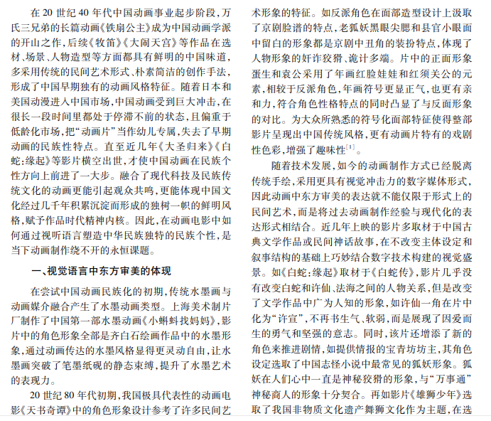 中华优秀传统文化博大精深,积淀着中华民族最深沉的精神追求,大力弘扬中华优秀传统文化,动 画制作是文化输出不可或缺的重要手段。本文从视听语言中的视觉和听觉两个方面分析中国动画如何理解和 融入传统文化,讨论在动画制作中塑造民族精神的方法。