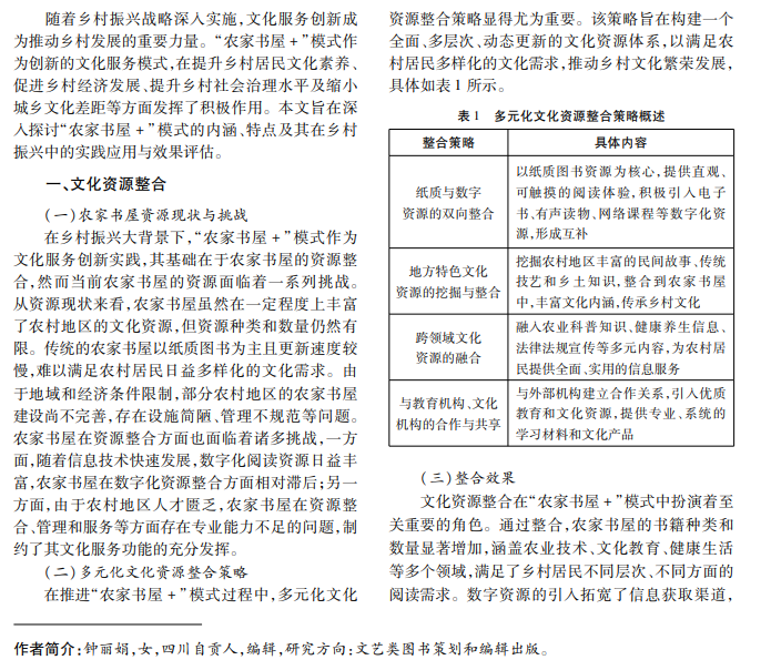 本文深入探讨农家书屋创新服务模式在乡村振兴中的重要作用,详细分析该模式对乡村文化、经 济、社会治理及城乡文化差距的长远影响,提出多元化文化资源的整合策略,探讨线上服务平台和线下服务平 台的架构以及效果评估,旨在发挥农家书屋的作用,助力乡村产业和文化振兴。