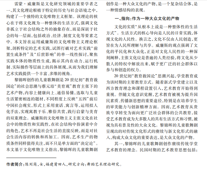 黎锦晖被誉为“中国儿童歌舞之父”,20世纪初,置身五四新文化运动的社会语境,他创作了十几部 儿童歌舞剧和 20多个歌舞节目,开创了中国儿童歌舞剧的先河。本文基于威廉斯的文化唯物主义指出,黎锦晖 的儿童歌舞剧创作是一种大众文化的产物,是一个复杂结合体,是一种情感结构的表现,以此视角分析黎锦晖的 儿童歌舞剧创作,试图打破对艺术实践“前置生成条件”及“后世影响”的探讨,而聚焦实践本体的物质性生成。