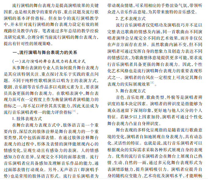 流行演唱为了全面、完整地呈现歌曲内涵,需要演唱者发挥舞台表现力,为流行音乐增添活力与吸 引力,引起受众情感共鸣。如何提升舞台表现力是流行音乐演唱者非常重视的课题。分析流行演唱舞台表现 力类型,并针对性地提出提升舞台表现力的方式和策略,以期推动流行音乐健康发展。