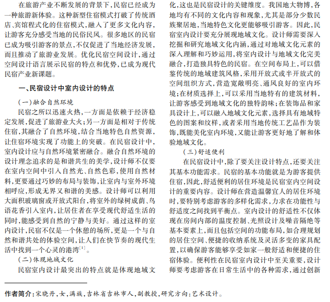 近年来,随着我国旅游业迅猛发展,相关周边产业获得了巨大发展。民宿是随着旅游产业发展而 崛起的一个重要产业,不仅可以为游客提供舒适便利的居住环境,而且能让游客感受当地的风土人情,已经成 为旅游的重要吸引元素。本文分析民宿室内设计空间语言,目的在于优化民宿室内空间设计,让游客获得优质 居住体验,促进旅游产业不断深入发展。