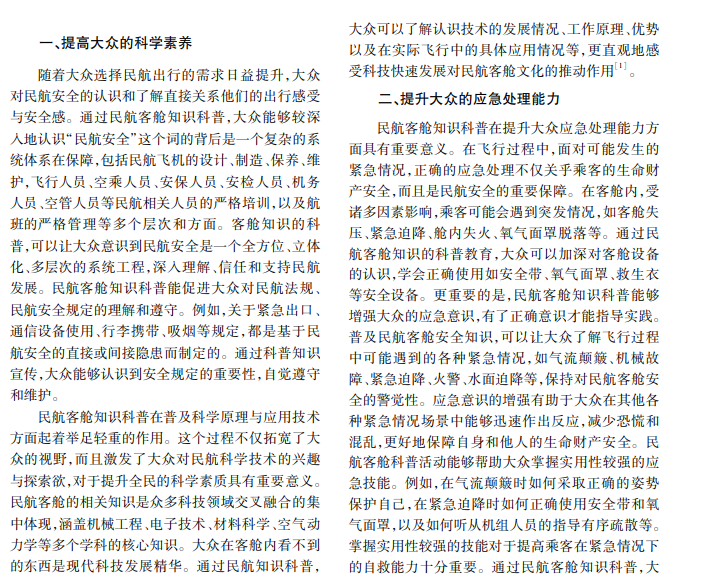 民航客舱知识科普可以提升大众的科学素养和民航安全意识,激发公众对航空科技的兴趣和探索 欲。民航客舱知识科普不仅是一项具有教育意义的社会活动,更是推动航空技术创新发展、民航文化多元交流 的重要途径。本文从民航客舱视角出发,分析客舱知识科普的重要意义。