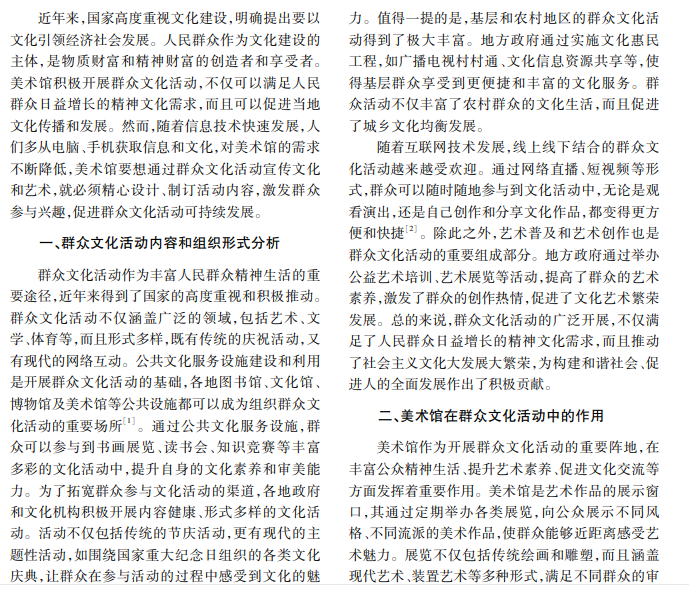 美术馆是一座城市里最能代表当地文化和审美的场所,肩负着艺术传承、传播的重任。在物质生 活已经得到极大满足的今天,美术馆开展的群众文化活动效果直接决定着人民群众的精神文化享受效果和文 化传播效果。本文阐述美术馆开展群众文化活动的具体策略和方式。