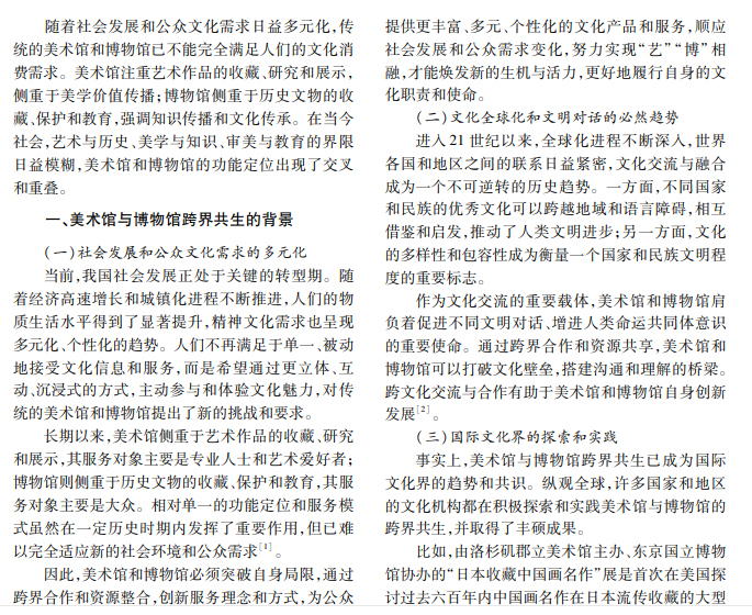在文化艺术事业蓬勃发展的时代背景下,美术馆与博物馆跨界共生已成为新的文化现象。“艺” “博”相融,不仅是物理空间的融合,更是两种文化机构在功能定位、运营模式和发展理念等方面的相互借鉴与 协同创新。跨界共生不仅为公众提供了更多元、立体的文化体验,而且为美术馆和博物馆的可持续发展提供了 新的思路和途径。本文从美术馆与博物馆跨界共生的背景、现状和意义入手,深入探讨两类文化机构融合发展 的路径,以促进文化事业创新发展。