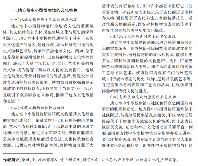 在浩瀚的文化海洋中,地方性中小型博物馆犹如璀璨星辰,虽规模不大,却承载着丰富的地域文化 和历史记忆。地方性中小型博物馆不仅是文化遗产的守护者,更是展示地方文化特色的重要窗口。然而,面对 大型博物馆的强势竞争和数字化浪潮的冲击,地方性中小型博物馆如何在夹缝中求生存、谋发展,成为亟待解 决的问题。本文深入探讨地方性中小型博物馆的文化特色与品牌建设策略,为其在新时代背景下可持续发展 提供参考。
