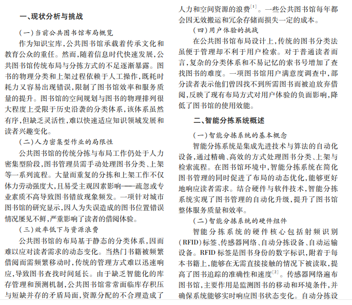 本文分析传统图书馆布局与分拣方式,介绍智能分拣系统的基本概念、组成要素和核心优势,重点 分析智能分拣系统在图书馆布局优化中的应用,结合案例展示该系统在实际设计、部署、实施后带来的显著效 益,最后探讨智能分拣系统可能遇到的问题,同时提出解决方案。
