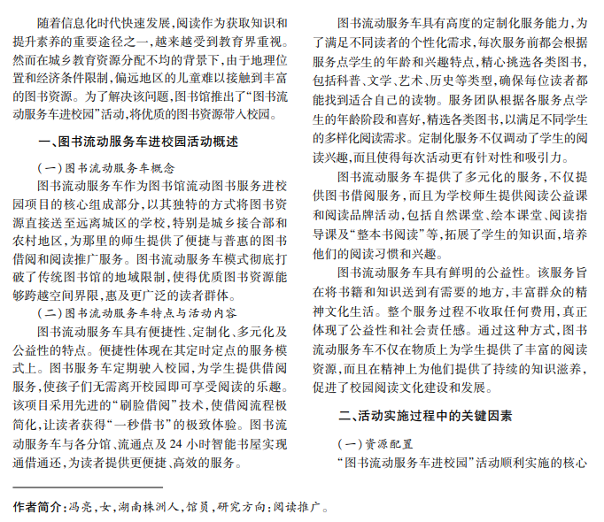 本文聚焦图书馆“图书流动服务车进校园”活动,通过对图书流动服务车的概念、特点、活动形式与 内容的阐述,分析其在激发学生阅读兴趣、促进校园阅读氛围形成方面的积极作用,同时深入研究活动实施过 程中的关键因素,并在此基础上提出了相应发展策略与建议,期望为图书馆更好地开展此类活动、提升校园阅 读水平提供参考和借鉴。