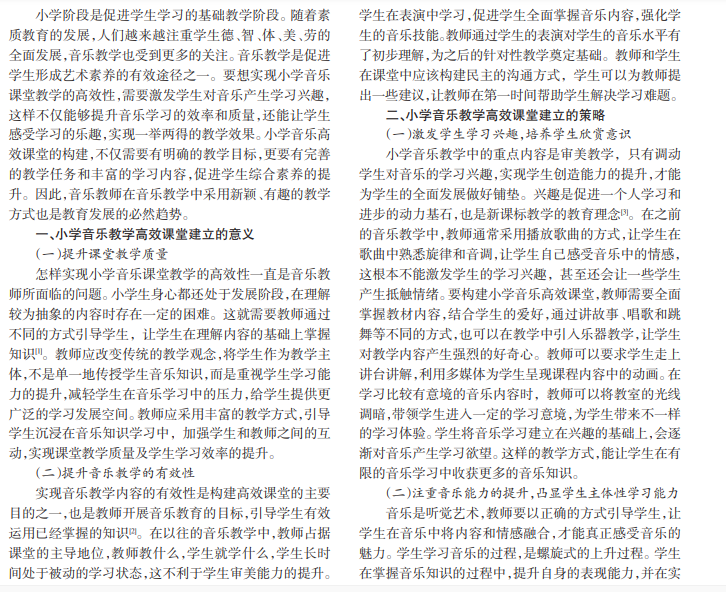 本文以小学音乐教学高效课堂建立的策略分析为重点进行阐述,首先分析了小学音乐教学高效课堂建立 的意义,其次深入探讨“激发学生学习兴趣,培养学生欣赏意识”“变抽象为具体,深化学生对内容的理解”“引入激励性 教学,注重学生情感教育”三个策略,旨在为相关研究提供参考资料。
