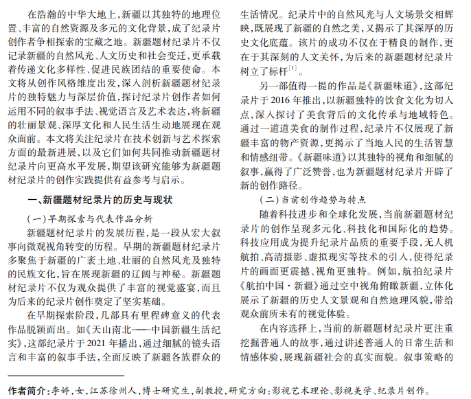 近年来,纪录片制作技术不断进步,观众审美需求日趋多元化,新疆题材纪录片以其深邃的内涵、 细腻的情感表达和宏大的叙事视角,赢得了广泛关注与好评。本文探讨新疆题材纪录片的创作风格,分析其如 何在尊重历史与现实的基础上,运用独特的艺术手法展现新疆的多样魅力,促进文化交流与理解。