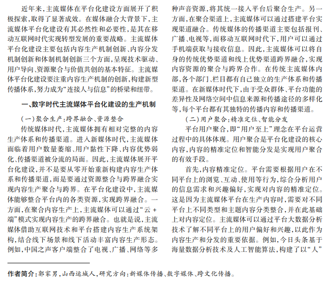 在全媒体时代,主流媒体融合转型的关键在于平台化建设。主流媒体通过平台化建设,整合内容 生产、用户运营和数据分析等功能,将更多的内容资源、用户资源、技术资源和数据资源集中在平台上,实现价 值赋能。主流媒体在平台化建设中要牢牢把握内容生产机制、用户运营方向和数据分析价值三个方面。基于 此,本文分析数字时代主流媒体平台化建设的生产机制、运营方向与传播价值。