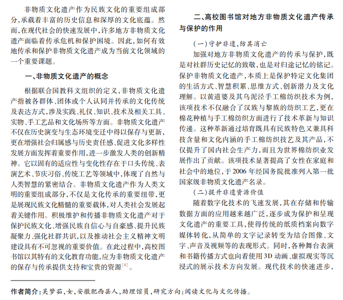 本文阐述非物质文化遗产的概念,分析高校图书馆作为知识传承与文化交流的重要平台如何有效 地参与地方非物质文化遗产传承与保护工作,最后提出高校图书馆在非物质文化遗产传承与保护方面的具体 策略。