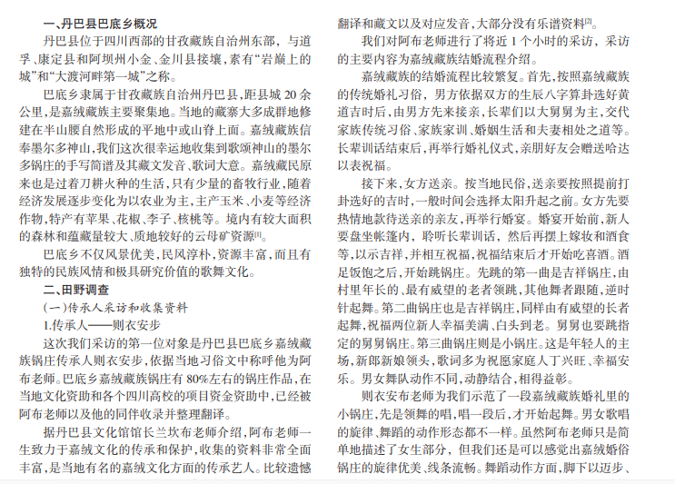 嘉绒藏族历经千年传承,锅庄文化更是有“活化石”之称的民族瑰宝。但近代嘉绒锅庄传承出现两次断层: 一次是特殊历史时期,造成大量作品失传;一次是外来文化入侵,造成嘉绒藏族锅庄无人传承的巨大危机。直到 2006 年,藏族“锅庄舞”被列为国家非物质文化遗产后,对嘉绒锅庄的保护和研究才逐渐好转。而丹巴县嘉绒藏族的特别之 处在于,丹巴的嘉绒藏族本土藏族族人深受汉族文化影响,慢慢地有了自己特殊的风格,是不同于其他藏族锅庄的独特 歌舞文化。