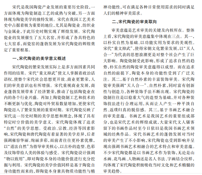 本文介绍宋代陶瓷的美学意义,分析宋代陶瓷基于传统信仰、政治文化、宗教理学、生活方式的审 美取向,最后从仿生的造型特征、平淡朴素的造型特征、仿古的造型特征、施釉特征、纹样肌理特征等维度探讨 宋代陶瓷的美学特征,希望对现代陶瓷业的发展起参考作用。
