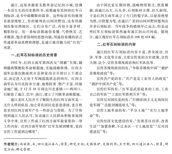 1932年至 1935年,红四方面军创建了以通江为中心的川陕革命根据地。为了加强党政方针、法令 政策的宣传,红四方面军利用通江山多、石头多的独特地理优势,在通江境内錾刻了大量红军石刻标语。这些 石刻标语见证了川陕革命根据地的创建、发展与壮大,是重要的革命文物,也是新时代开展爱国主义教育与党 史学习教育的生动教材。文博工作者要保护好通江的红军石刻标语,以其为载体讲好党的故事、红军的故事, 大力传承与弘扬红色文化,进一步推动社会主义先进文化繁荣兴盛。