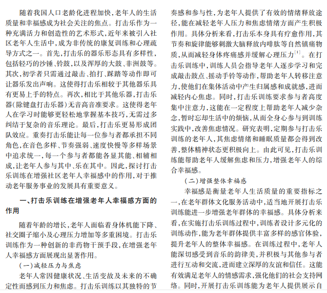 在针对老年群体的社会艺术文化服务中引入打击乐训练,能让老年人深切体验打击乐的魅力,获 得精神层面的满足。本文在深度分析打击乐训练在增强老年人幸福感的基础上,尝试从提升老年人幸福感的 角度,对打击乐训练具体措施进行探究。