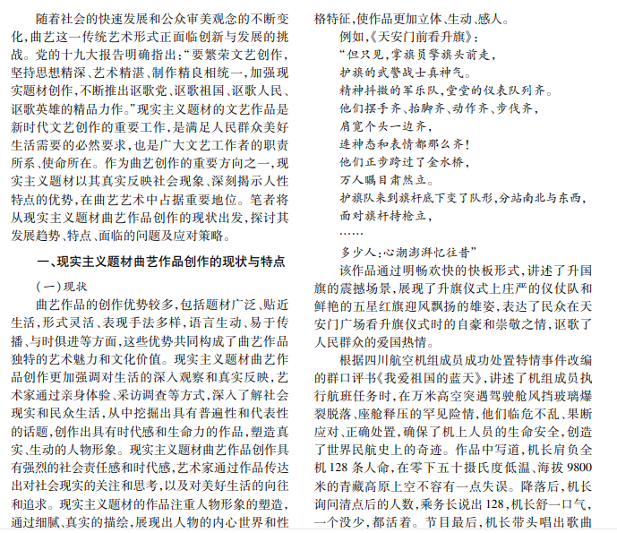 现实主义题材曲艺创作是文艺创作中的重要领域,通过具体的人物、事件反映现实生活和社会变 革,展现时代精神和社会现实。本文探讨曲艺创作中现实主义题材的背景及现状,分析其面临的挑战,揭示其 中存在的问题,并提出针对性对策和创新方法,促进现实主义曲艺创作创新发展。