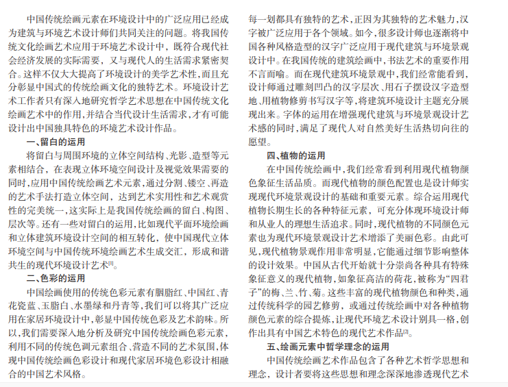 随着现代经济社会的快速发展,传统绘画文化艺术元素正在慢慢地渗透我们的日常生活,如中国传统的 绘画、音乐、书法、雕刻、诗歌、戏曲、瓷器及传统刺绣等。中国式的艺术符号是弘扬中华民族传统精神,展现中华民族传 统文化艺术内涵的独特艺术形式。因此,随着绘画艺术在人们日常生活中扮演着越来越重要的角色,人们不再把审美 眼光局限于研究环境的物质美、装饰美,而是更多注重研究环境与传统绘画文化的紧密联系。本文具体介绍了中国传统 绘画元素在环境设计中的应用。