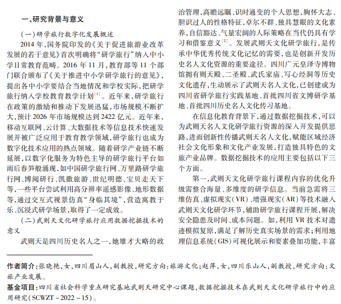 随着人工智能时代的到来,大数据技术已成为推动研学旅行发展的重要手段。本文对数据挖掘技术 在武则天文化研学旅行中的应用进行设计,并提出加强隐私权益保护和提升数据安全管理水平的建议,旨在为优 化研学旅行课程内容、提升数字化服务水平、减少安全事故隐患、推动武则天文化研学旅行可持续发展提供思路。