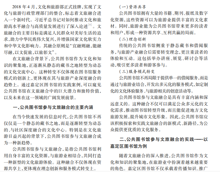 公共图书馆参与文旅融合不仅能满足公众文化需求,而且能推动图书馆转型升级,促进地方文化 旅游发展。上海市嘉定区图书馆通过资源共享、理念创新和服务模式转变,成功打造了“最美图书馆”“我嘉书 房”等经典案例。本文以该馆为例,探讨公共图书馆参与文旅融合的内涵、实践和挑战。