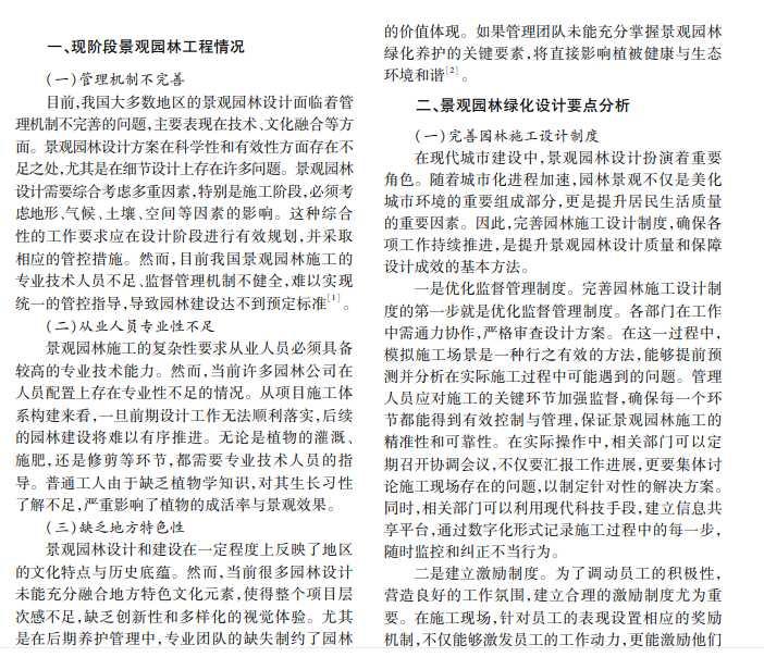 城市是现代社会的缩影,其环境质量直接影响民众的生活品质。良好的生态环境不仅能够提升城 市形象,更能促进市民身心健康。在城市建设中实现生态环境保护及其质量提升,成为重要任务。本文主要探 讨景观园林绿化设计及养护,以期美化城市,缓解环境压力。