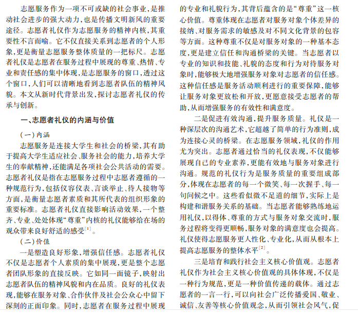 本文从不同视角探讨在新时代背景下志愿者礼仪的内涵、价值及其在志愿服务中的重要性,分析 志愿礼仪的传承与创新,提出加强志愿者礼仪教育的策略。