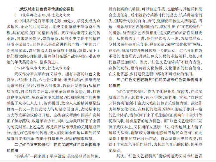 作为普适性极强的一种艺术形式,音乐中蕴含着深刻的思想内涵,能够打破文化、时空界限,引发听众共 鸣,使其在身临其境的氛围中,获得或欢愉或悲伤的情感体验。红色音乐是音乐的重要组成部分,它起源于革命年代,与 党的发展历程相交融、相汇聚,具有极高的研究、传播价值。本文聚焦武汉“红色文艺轻骑兵”,对其在城市红色音乐传播 中发挥的作用、未来的发展路径进行系统论述。