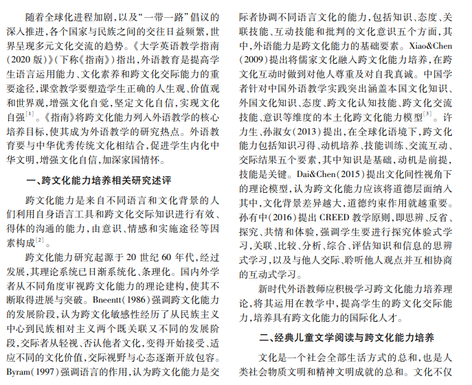 本文通过梳理国内外跨文化能力培养理论的发展与现状,分析当前大学英语教学如何满足全球化 发展与“一带一路”倡议的需要,并从跨文化培养理论的三个要素,即认知、情感和行为探讨以阅读外国经典儿 童文学为途径提高大学生跨文化能力的方法。
