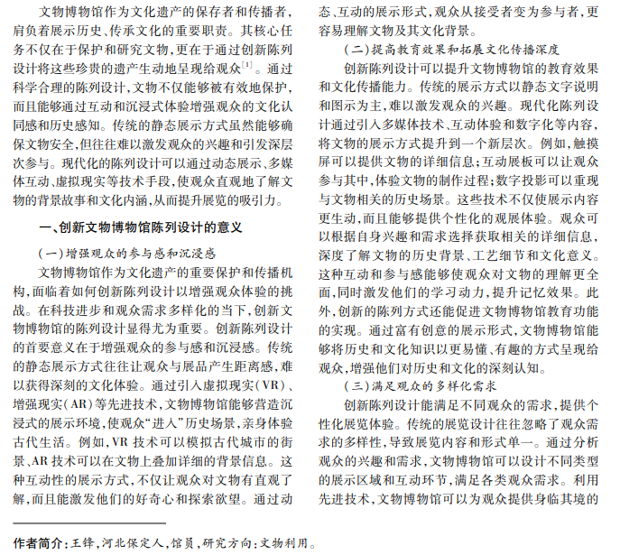 创新陈列设计不仅是一种视觉表现手法,而且是将理念、思想等转化为可视化形象的创造性行为。 文物博物馆通过引入先进的技术和设计理念,打破传统展示模式的局限,不仅能提升展览吸引力,而且可以传 达文物历史背景和文化价值,满足不同观众的需求,并提升博物馆影响力。本文阐述文物博物馆传统陈列设计 的局限性和存在的问题,提出创新陈列设计措施。
