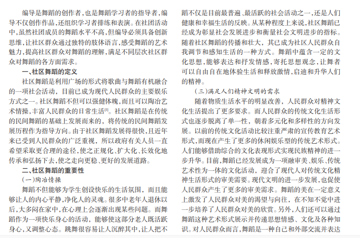 舞蹈是一种具有空间性、实践性和综合性的动态造型艺术,富有强烈的节奏感,是人表达情感和增强人体 协调力量的重要工具。千姿百态的舞蹈动作有助于演员更深入、更直观地体会和掌握舞姿所传递的信息与情感。如今, 舞蹈这种艺术已经深入社区群众的日常生活中,不但让广大社区群众获得精神享受,而且为广大社区群众搭建了情感 交流的桥梁,丰富了广大社区群众的人际关系。本文着重讨论社区舞蹈编导创新性思维。