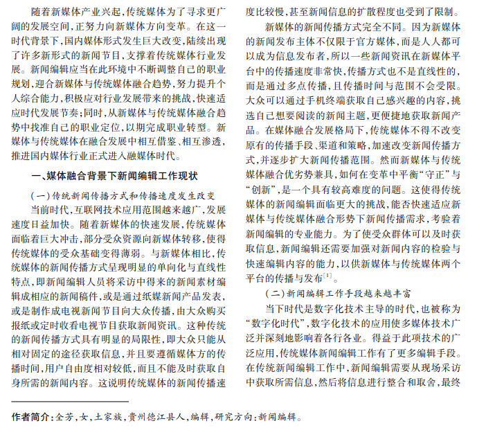 媒体融合背景下,国内新闻媒体发展形势发生了巨大改变,包括新闻编辑形式的改变。本文从新 媒体与传统媒体融合背景下的新闻编辑工作发展现状出发,提出提升新闻编辑能力的建议与策略。
