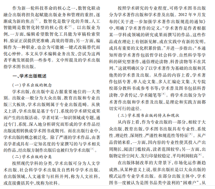随着出版融合的进一步发展,数智化工具在出版领域的应用场景不断扩大。在整个出版业占据重 要分量的学术出版也面临着新科技浪潮的冲击。本文剖析学术出版的现状与困境,从需求端出发,为数智工具 的研发与升级提供参考路径。
