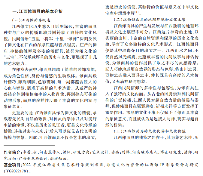本文探讨在现代科技、营销学、传播手段及设计理论框架下,江西傩面具在新时代的传播与推广策 略,通过对其内容和形式的细致梳理,提炼典型文化符号,构建高辨识度文化识别系统,以尊重并传承文化原 貌,并提出利用江西傩面具作为 IP角色,探索与现代产业跨界合作的多元化路径,旨在形成一套具有实践指导 意义、可操作性强的传播推广方案,促进江西傩面具“文化身份”的广泛认知与传承。
