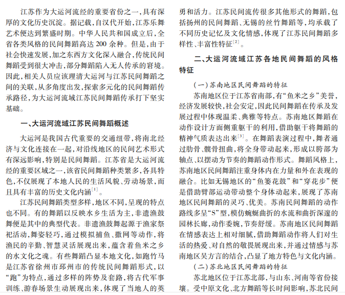 大运河是我国古代一项伟大的水利工程,在历史上促进了南北经济与文化的交流,是重要的文化 遗产。江苏作为大运河流经的重要省份之一,其民间舞蹈源远流长,是中华文化宝库中的瑰宝。本文围绕大运 河流域江苏民间舞蹈展开分析,简述大运河流域江苏各地域民间舞蹈的风格特征,在明确大运河与江苏民间舞 蹈关联的基础上,结合当前大运河流域江苏民间舞蹈传承现状,研究传承对策。