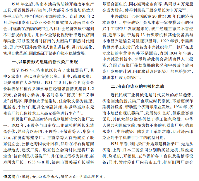 1918年,东元盛染厂引进简单机器并投入使用,标志着济南印染业开始走上转型之路。之后,一些 染户与时俱进,逐渐将手工染坊发展成机器染厂。济南本地各大染厂为了提高市场竞争力,通过集资、技术革 新、产品研发和跨区销售等方式,使得近代济南印染业在 1918年至 1936年中稳步前进,呈现欣欣向荣的成长 态势。