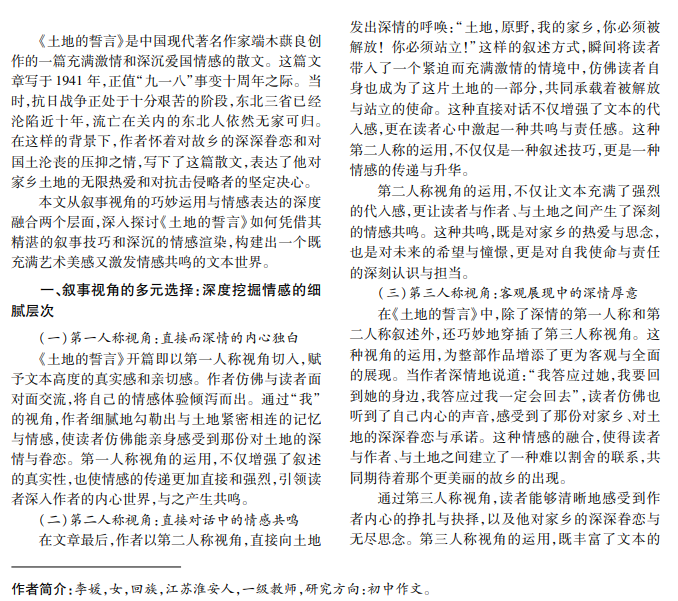 《土地的誓言》作为文学艺术领域的璀璨星辰,通过巧妙的叙事视角和深刻的情感表达,构建了一 个既充满艺术美感又激发情感共鸣的文本世界。文章从叙事视角的多元选择和情感表达的深度融合两个层面 进行深入探讨。
