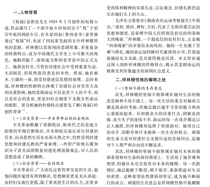 小说《祝福》中的主人公祥林嫂是旧社会无数女性命运的缩影,她的性格受历史环境与社会背景的 影响,其复杂而多维的性格特点,向世人展示了旧社会制度下女性的生存困境与精神痛苦。