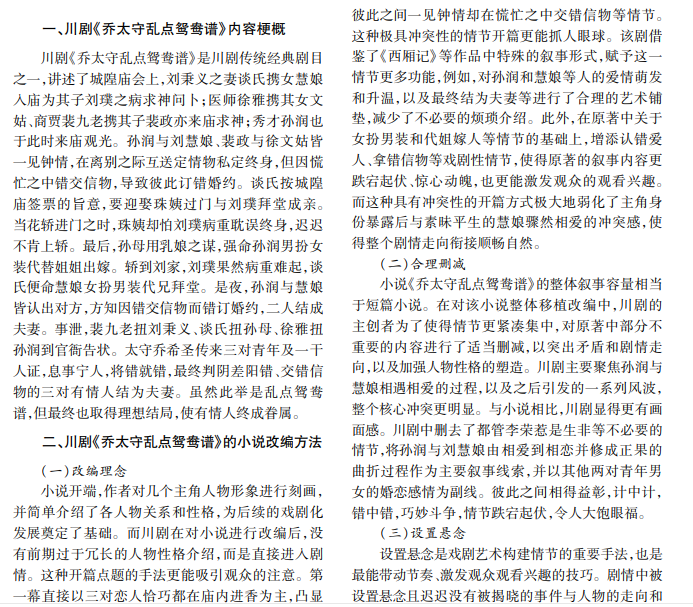 川剧《乔太守乱点鸳鸯谱》改编自小说《醒世恒言》,具有极强的艺术性。本文简要阐述该剧改编方 法,从民俗艺术和喜剧艺术两方面展开分析,旨在帮助深入理解川剧《乔太守乱点鸳鸯谱》。