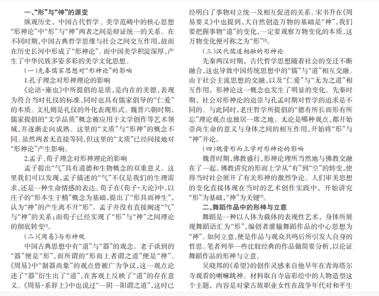 新时期的中国舞蹈经历了半个多世纪的风风雨雨,目前依旧在传统和当代的双重考量下茁壮成长。形神 论思想自古以来就贯穿于中国传统艺术之中。在舞蹈作品中,形神的融合体现了作品的最高艺术水平和要求。本文中, 笔者从“形”“神”的源变以及部分作品中“形神”如何“立意”来剖析舞蹈作品中的形神立意问题,力求为舞蹈事业提供一 定的实践意义及理论价值。