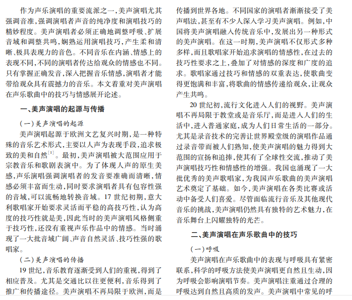在声乐歌曲的美声演唱中,技巧掌握和情感表达影响演唱效果。只有技巧和情感相辅相成,才能 使声乐演唱生动感人。技巧是情感的基础,情感是技巧的升华。本文围绕美声演唱的技巧与情感表达运用展 开研究分析。